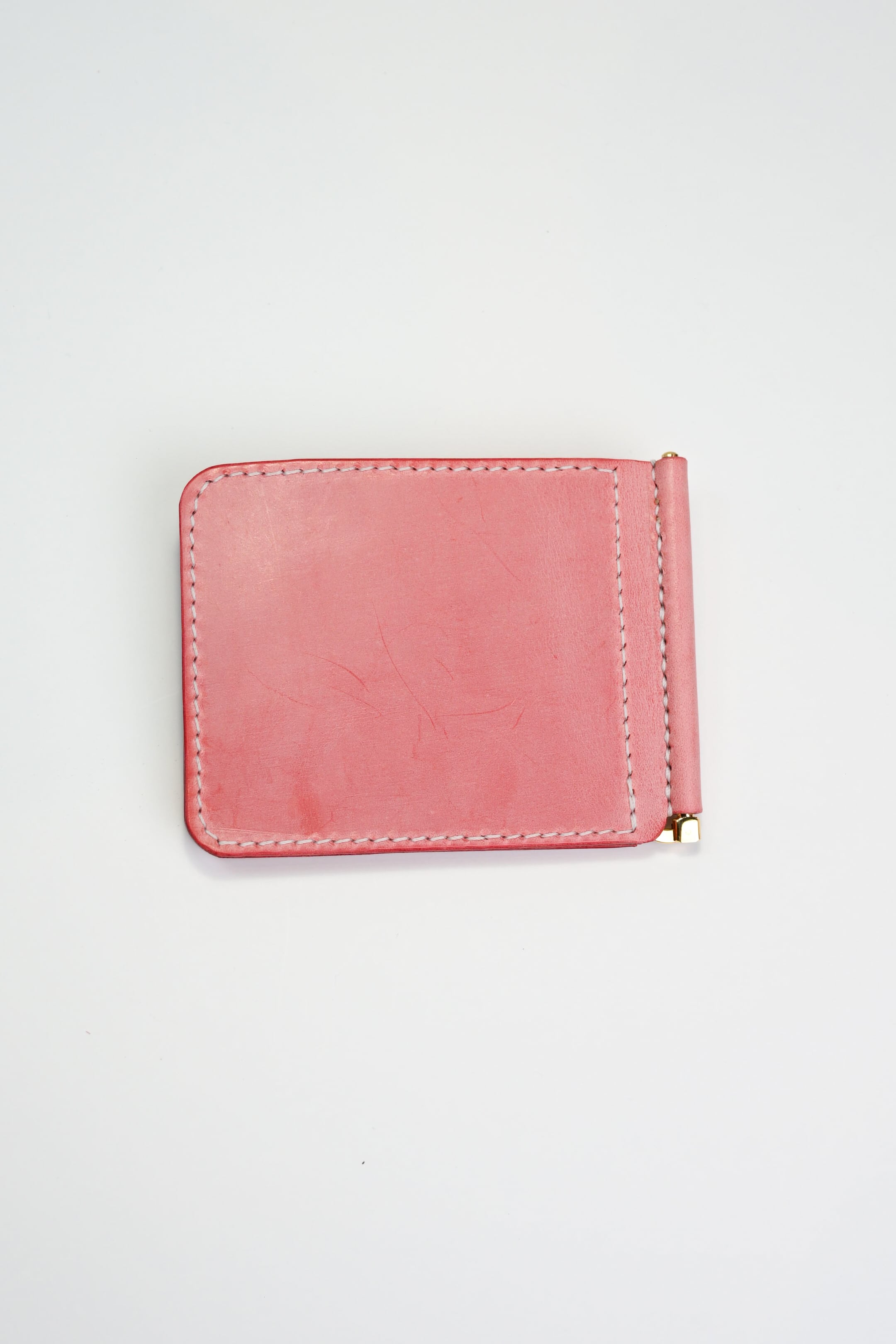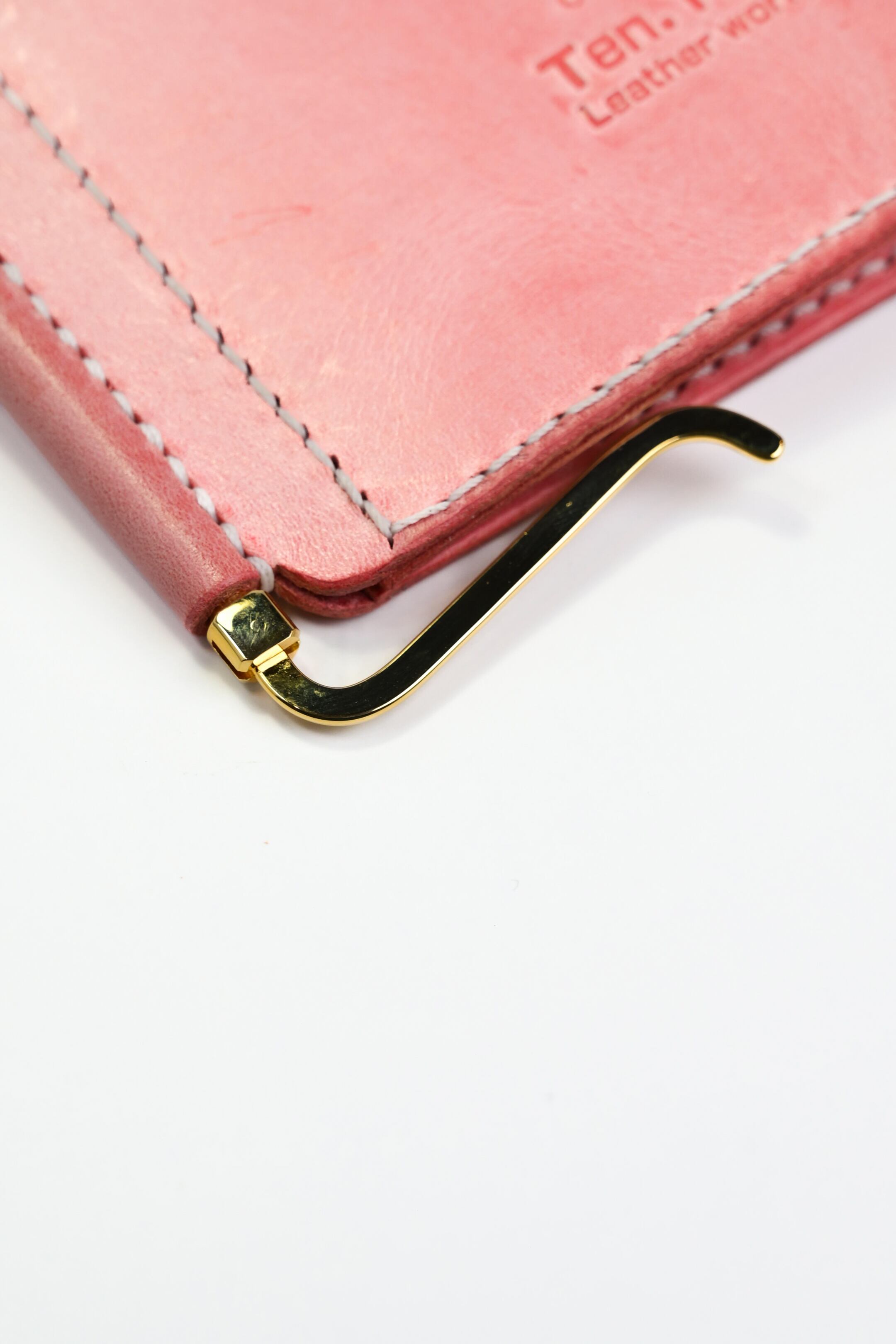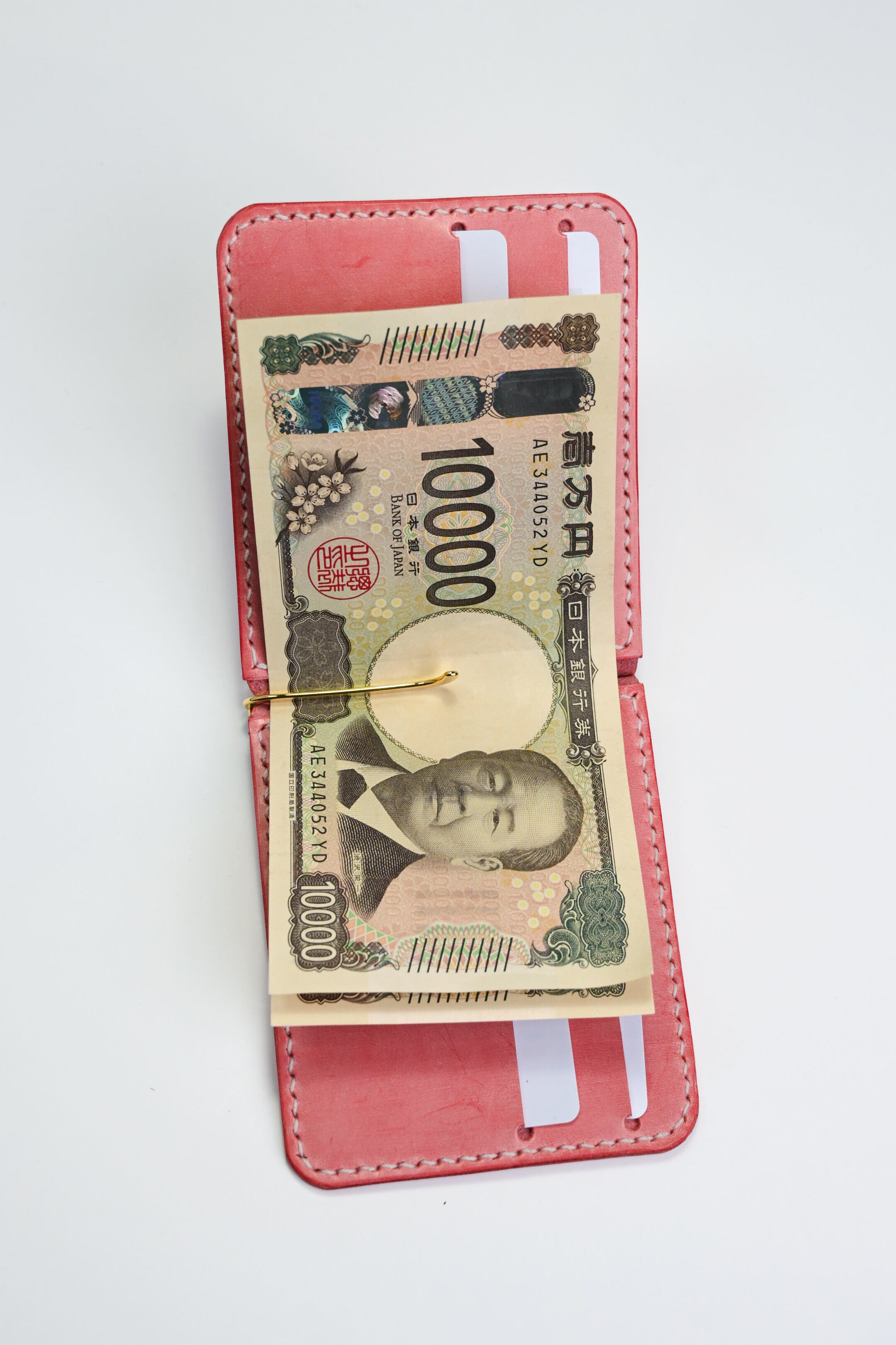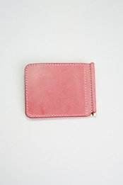 ピンクのレザーで仕立てたお札とカードがペラっと収まるマネークリップ 。