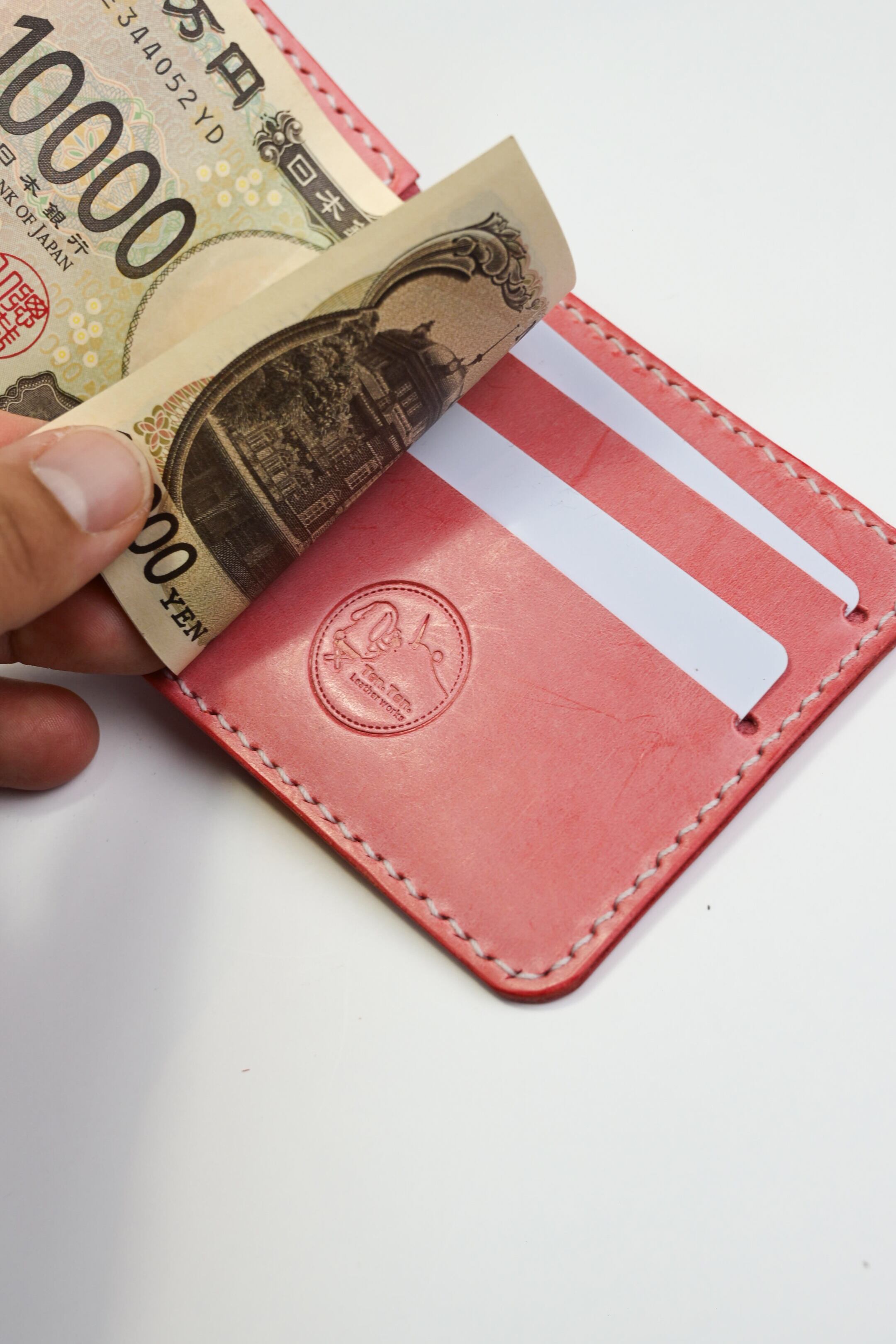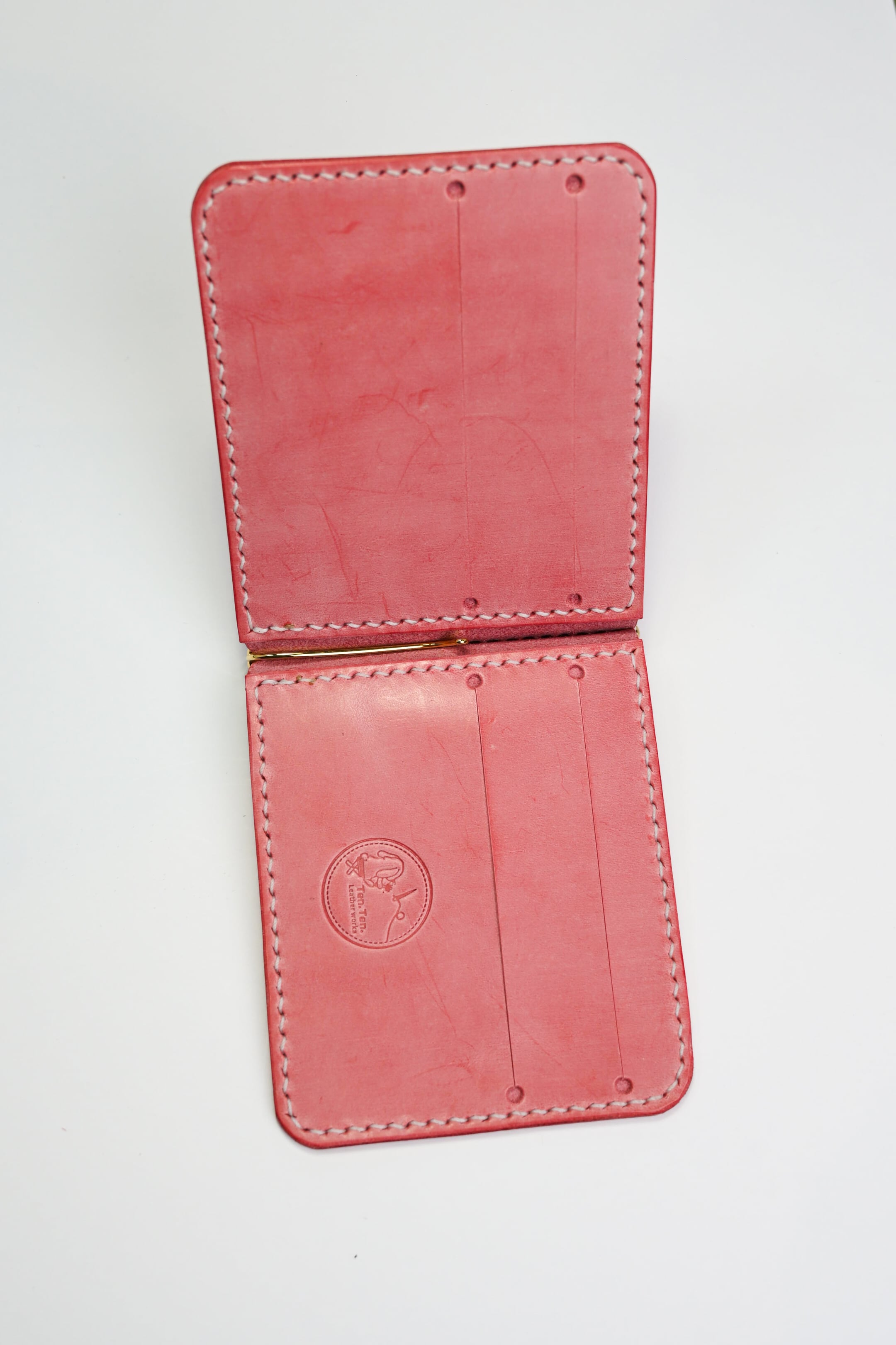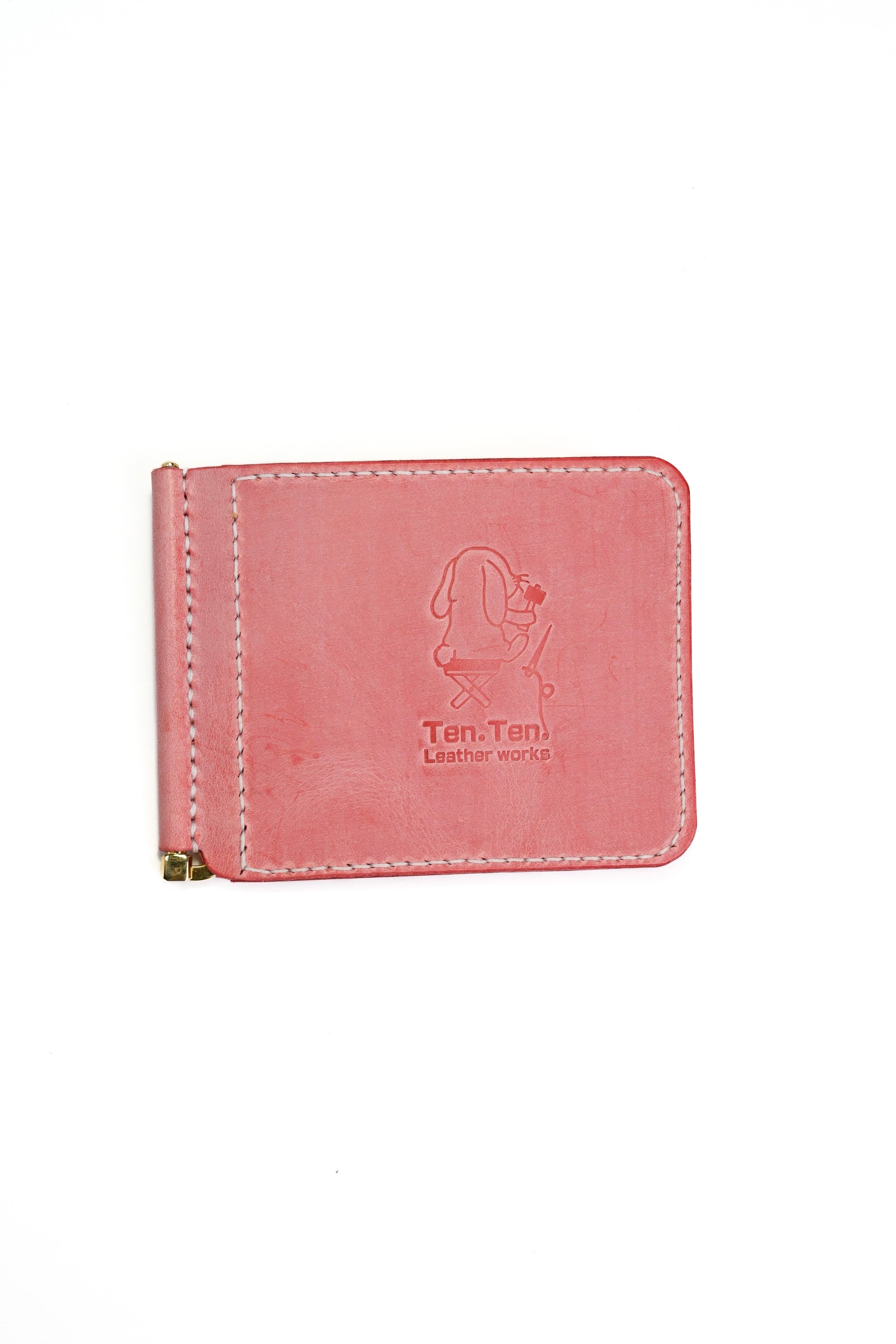 ピンクのレザーで仕立てたお札とカードがペラっと収まるマネークリップ 。